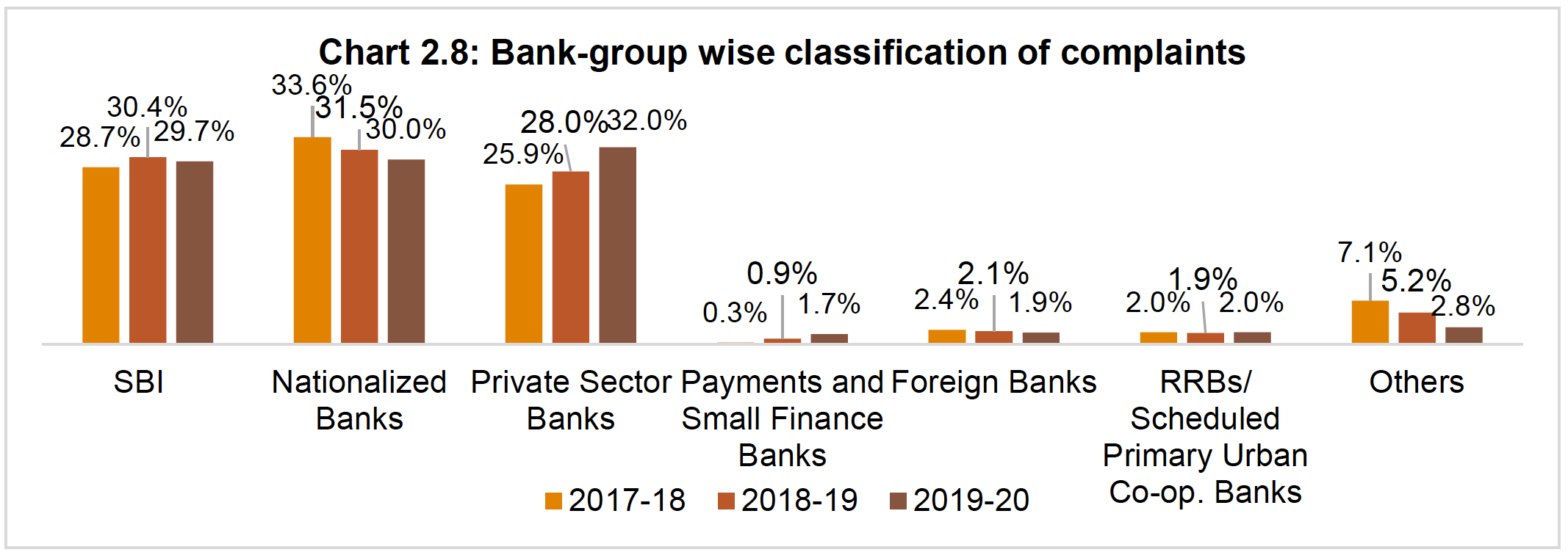 Payment and Small Finance Banks, which make a significant chunk of the Security Controls, hardly receives any complaints. Majority of it comes from private banks (supposedly due to the fact that their customers are more prone to digital transactions), followed by nationalised banks, followed by SBI - which apparently generates more than a quarter of the total complaints!