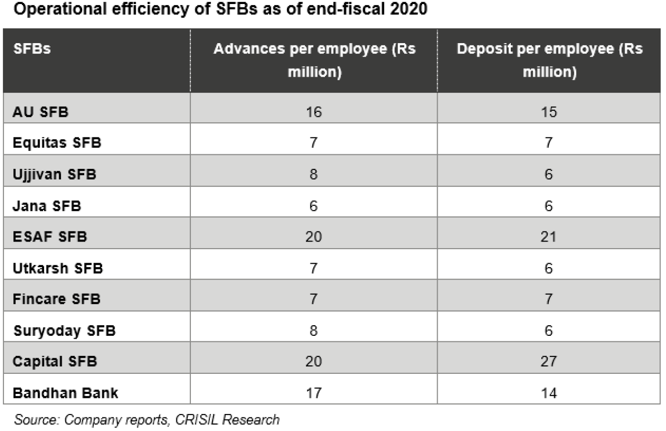 Business per employee (measured through loans and deposits) is actually a good measure of how efficient a bank is. Seeing the chart below, it seems Capital, ESAF and AU are leading the pack here. (Ignore Bandhan here - it became a universal bank from a NBFC-MFI years ago)