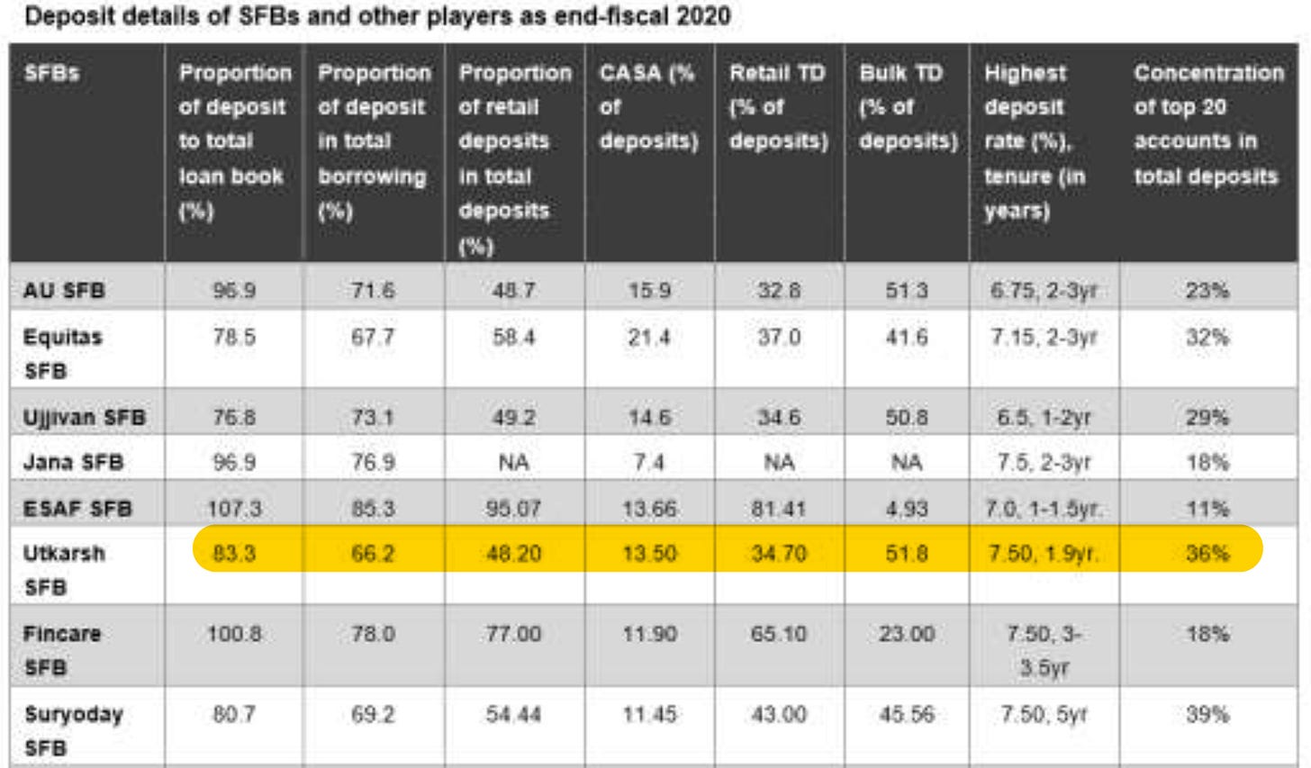 According to the document, “Utkarsh has the highest proportion of bulk term deposits in total deposits at 51.8% amongst the peer set.”