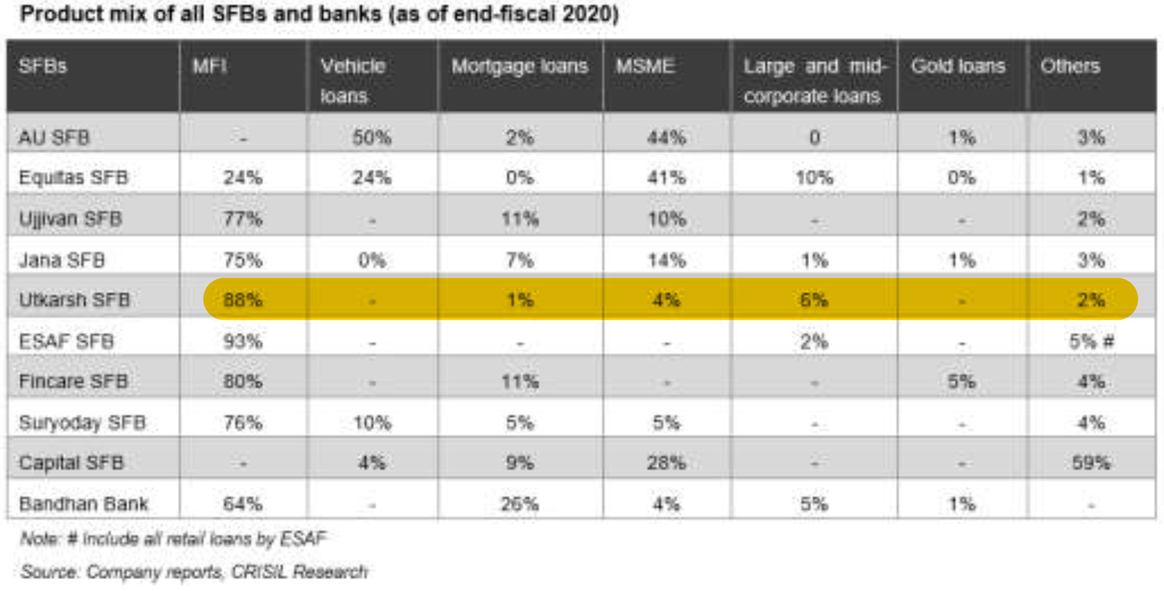 Here’s how the different SFB stack up against each other in terms of product portfolio. Since most of them have converted from a Micro Finance Institution (MFI), you will see a heavy concentration in that segment. This is where AU and Equitas have a significant advantage. Of course, that doesn’t mean its a disadvantage either. It all depends on how efficient your collections are (loan repayments and pre-payments). Although Utkarsh does state this:
